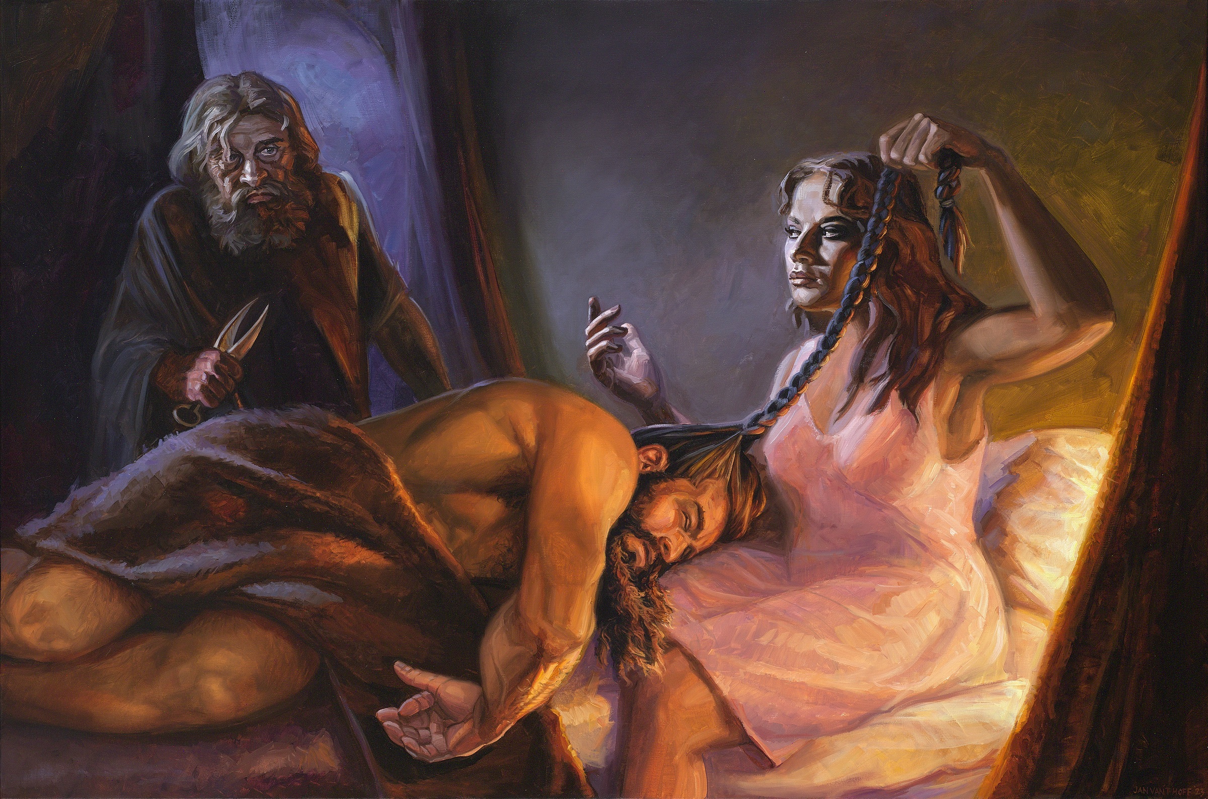 She made him sleep on her knees. And she called a man and had him shave off the seven locks of his head. Then she began to torment him, and his strength left him.Full bible text