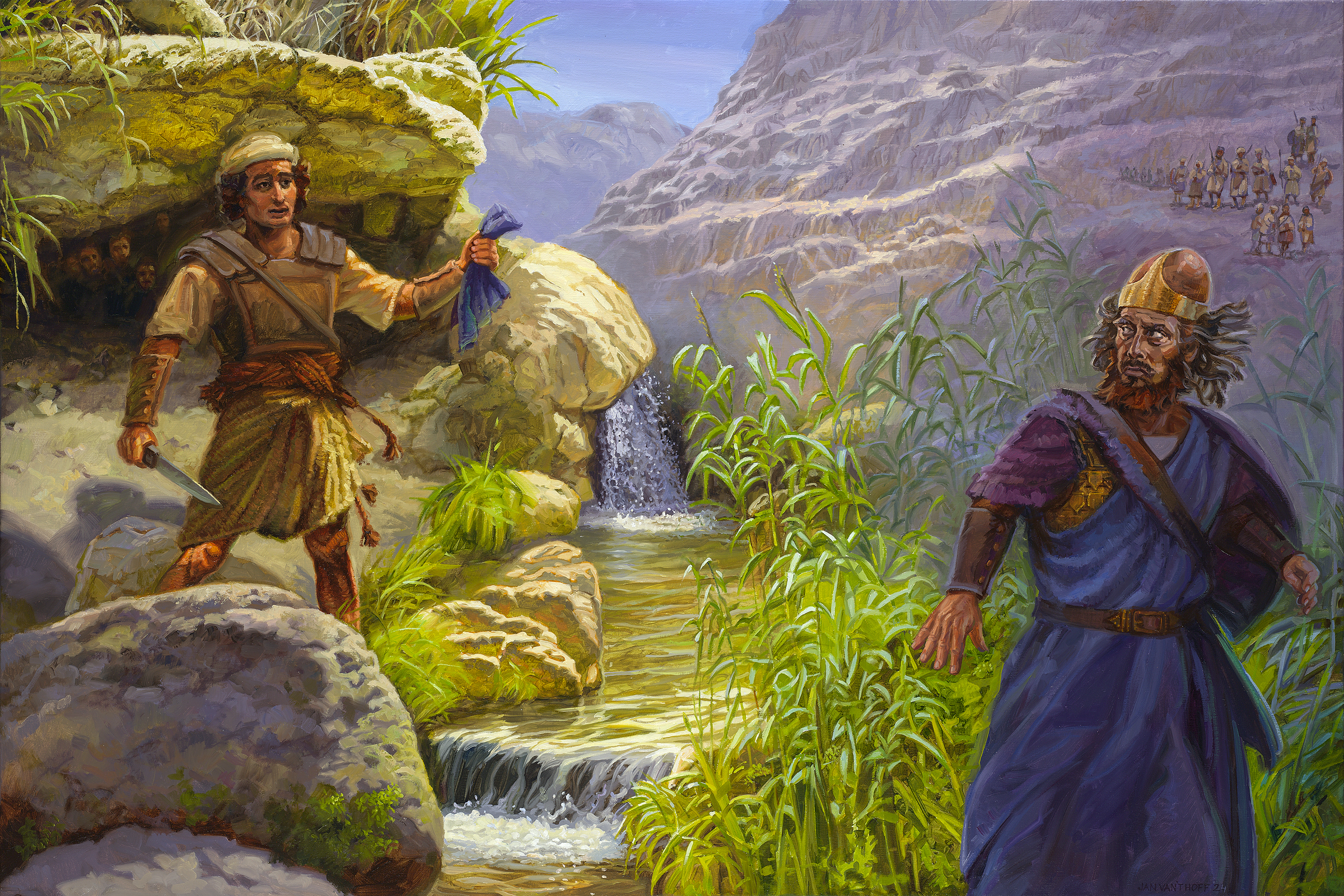 Saul chases after him with 3,000 of his best men. David and his men are hidden in a large cavern. It is precisely in that cave that Saul comes to relieve himself. David has the opportunity to kill Saul; God, as it were, gives him into his hand. But David shows respect for Saul as God's anointed king. Although David has already been anointed king over Israel, he waits for God's time and does not incur bloodguilt.