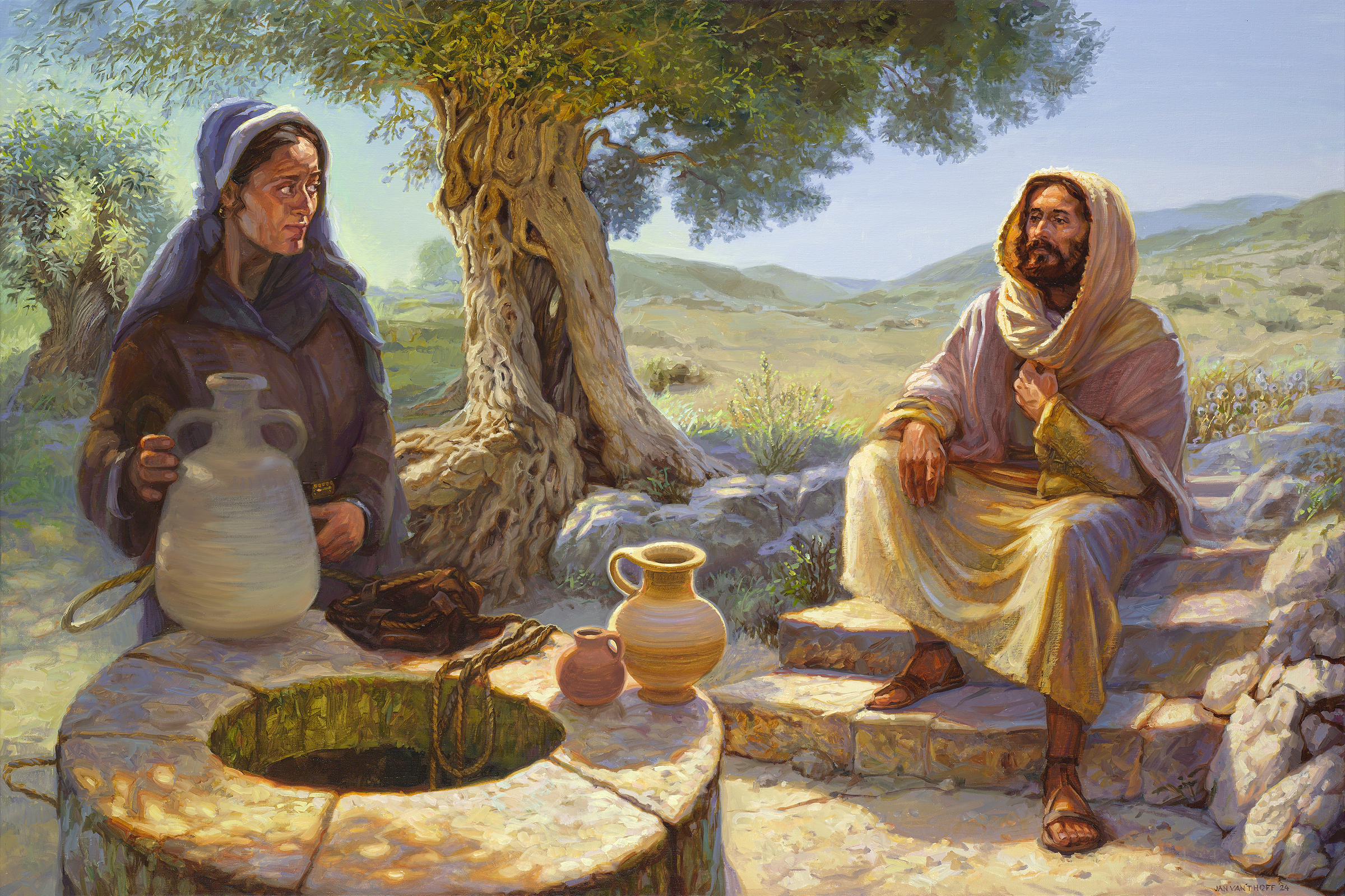 Jesus comes to Jacob's well, near ancient Shechem, at the foot of Mount Gerizim. Weary, he sits down. It is mid-day.