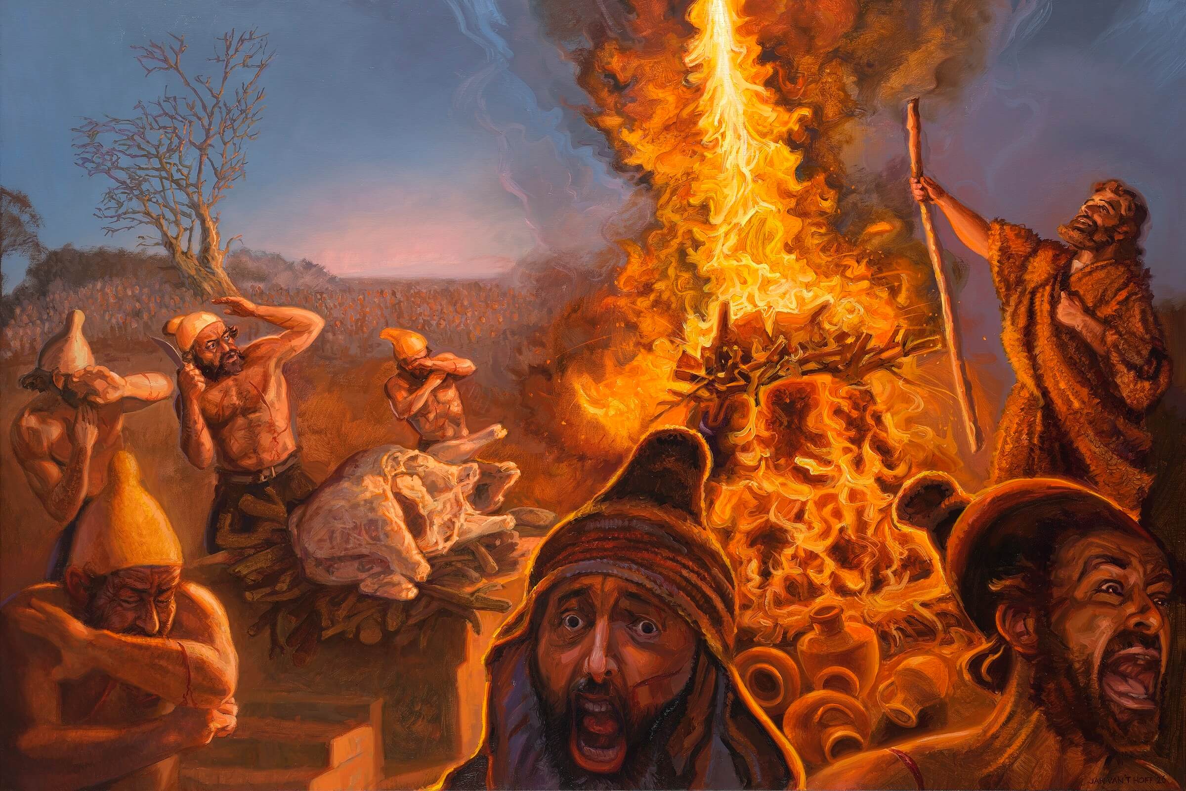 20 So Ahab sent to all the people of Israel and gathered the prophets together at Mount Carmel. 21 And Elijah came near to all the people and said, “How long will you go limping between two different opinions? If the Lord is God, follow him; but if Baal, then follow him.” And the people did not answer him a word. 22 Then Elijah said to the people, “I, even I only, am left a prophet of the Lord, but Baal's prophets are 450 men. 23 Let two bulls be given to us, and let them choose one bull for themselves and cut it in pieces and lay it on the wood, but put no fire to it. And I will prepare the other bull and lay it on the wood and put no fire to it. 24 And you call upon the name of your god, and I will call upon the name of the Lord, and the God who answers by fire, he is God.” And all the people answered, “It is well spoken.” 25 Then Elijah said to the prophets of Baal, “Choose for yourselves one bull and prepare it first, for you are many, and call upon the name of your god, but put no fire to it.” 26 And they took the bull that was given them, and they prepared it and called upon the name of Baal from morning until noon, saying, “O Baal, answer us!” But there was no voice, and no one answered. And they limped around the altar that they had made. 27 And at noon Elijah mocked them, saying, “Cry aloud, for he is a god. Either he is musing, or he is relieving himself, or he is on a journey, or perhaps he is asleep and must be awakened.” 28 And they cried aloud and cut themselves after their custom with swords and lances, until the blood gushed out upon them. 29 And as midday passed, they raved on until the time of the offering of the oblation, but there was no voice. No one answered; no one paid attention.