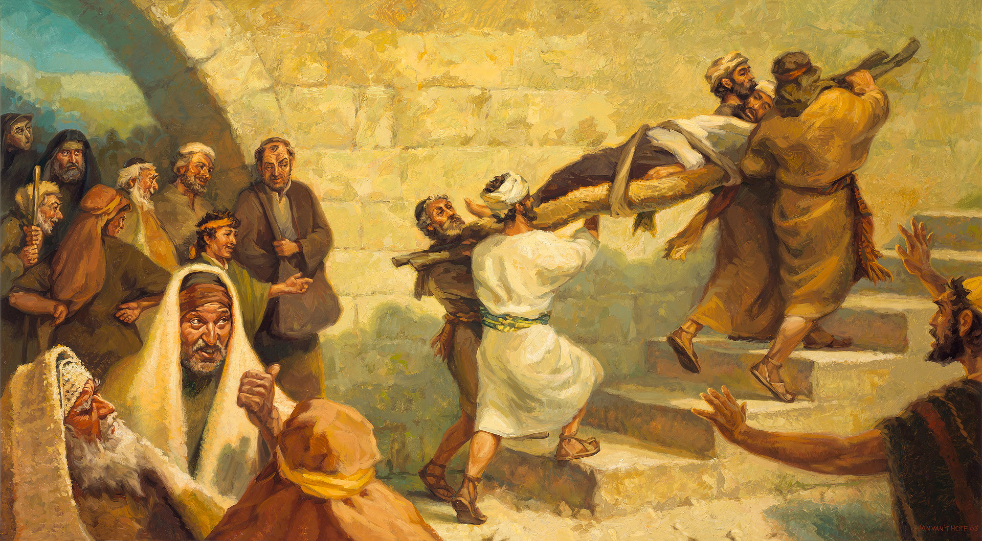 This painting shows the friends who are determined to take their friend to Jesus. They are ready to face any obstacle and willing to do their utmost. Their faith overcomes it all.