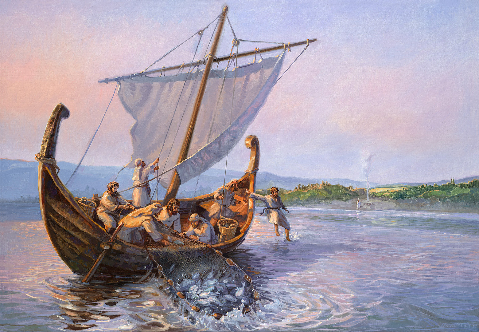 He said: “Throw your net on the right side of the boat and you will find some.” When they did, they were unable to haul the net in because of the large number of fish.Then the disciple whom Jesus loved said to Peter: “It is the Lord!” As soon as Simon Peter heard him say 'It is the Lord'. he wrapped his outer garment around him (for he had taken it off) and jumped into the water.