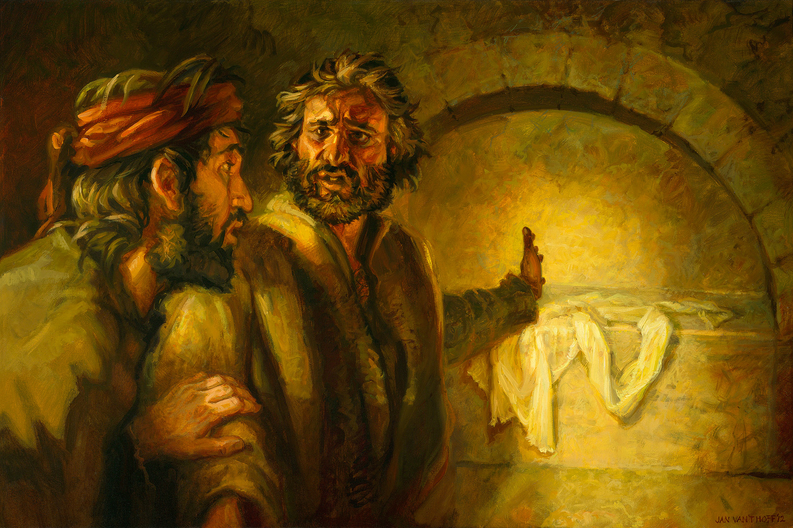 After Mary Magdalene has reported to the disciples that the stone of Jesus’ grave was removed, Peter and John run to the grave. John arrives first, but Peter enters the grave first.