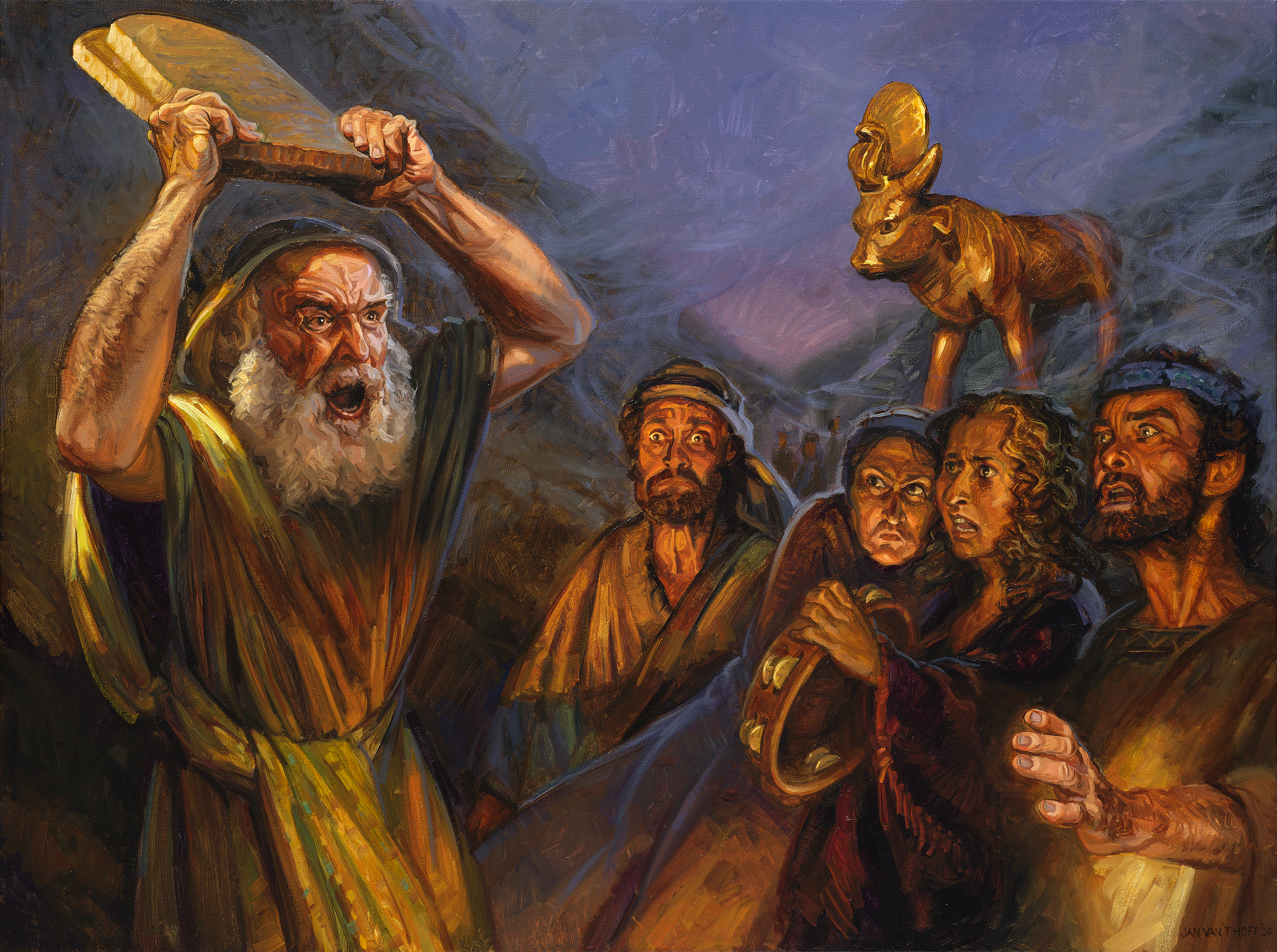 And as soon as he came near the camp and saw the calf and the dancing, Moses' anger burned hot, and he threw the tablets out of his hands and broke them at the foot of the mountain.Full bible text