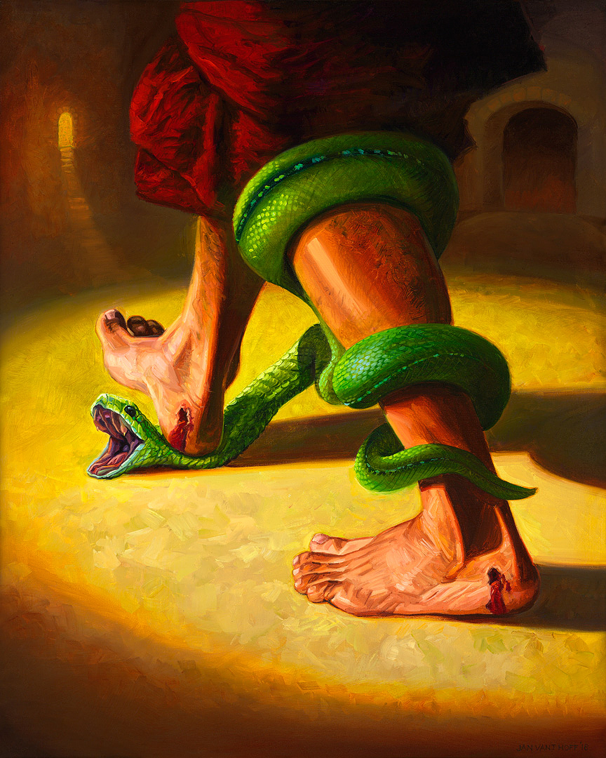In this symbolic painting ‘the offspring of the woman’ (Jesus) bruises the head of the snake (which is Satan).
