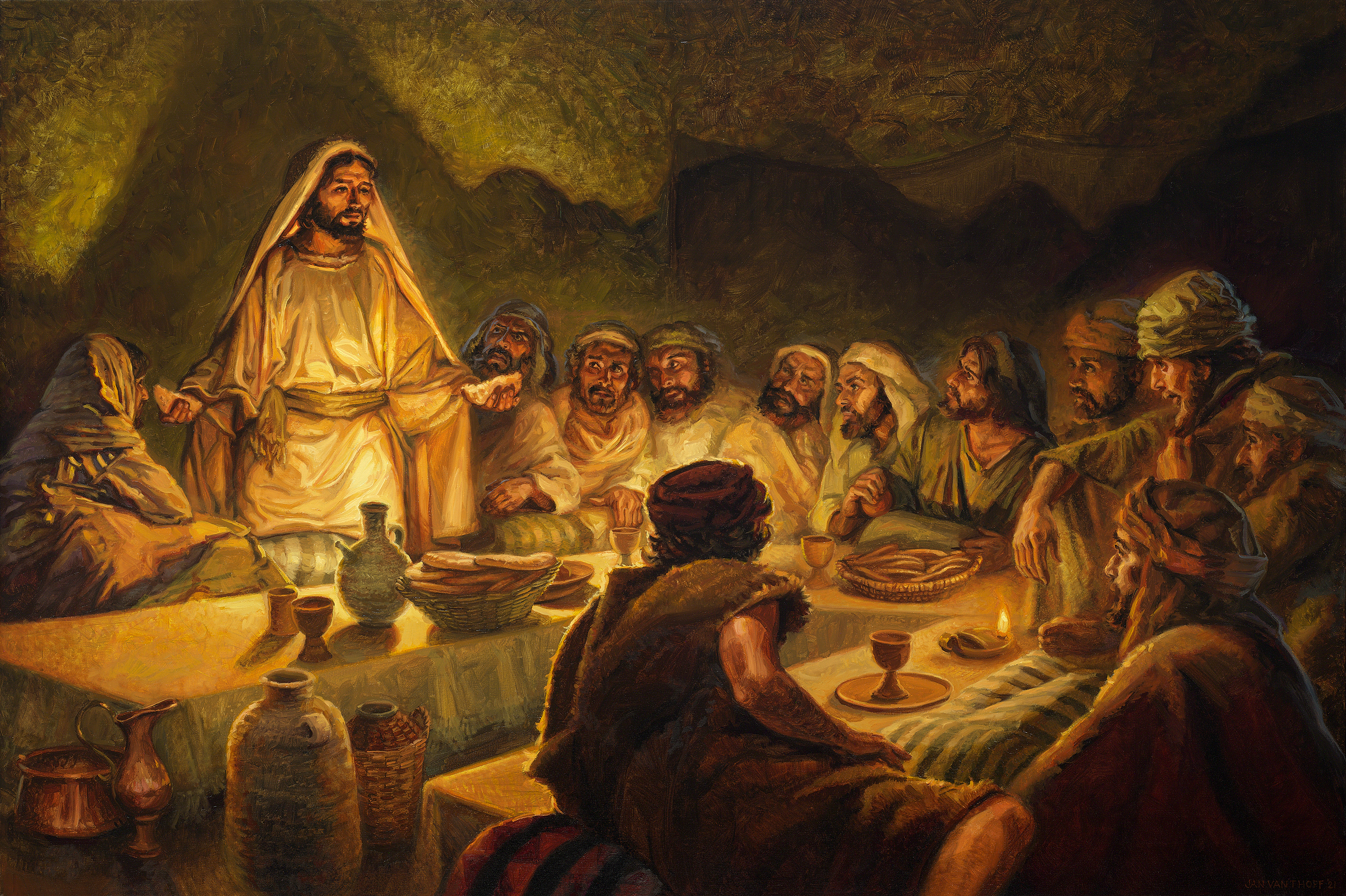 During the Passover meal Jesus institutes the Holy Supper; the meal of the New Covenant. Jeremiah 31. Jesus takes bread, gives thanks to His Father, breaks it it and gives it to them, saying: "This is my body, which is given for you. Do this in remembrance of me".