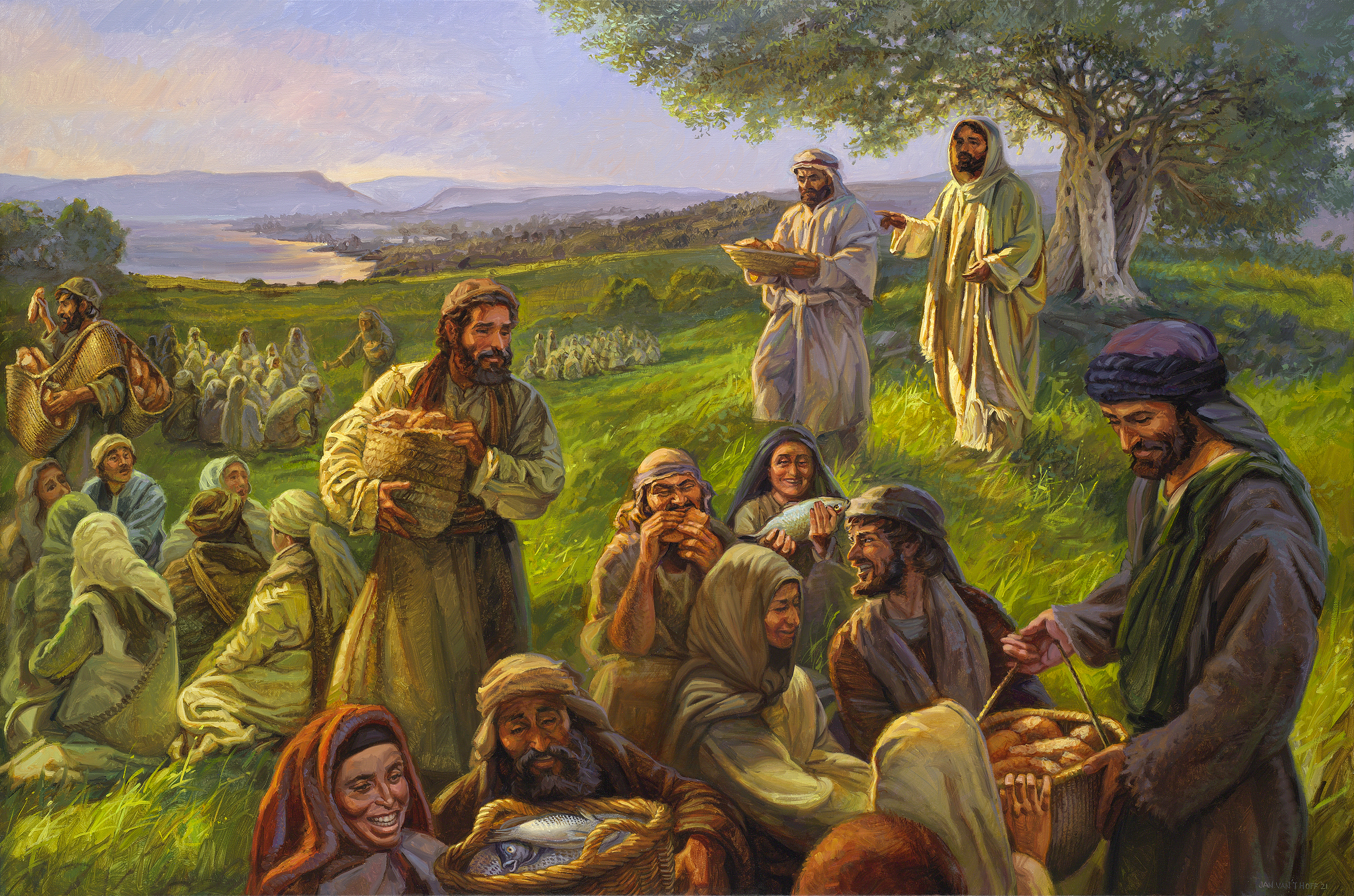 Jesus is moved with compassion for the people, who are like sheep without a shepherd, and teaches them. When the crowd gets hungry in the evening, He miraculously provides bread and fish.